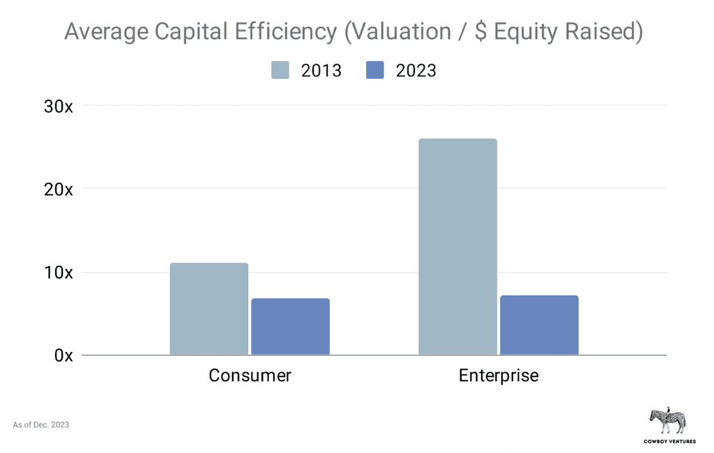 Over the past decade, the capital efficiency of enterprise startups (as measured by a startup’s valuation divided by the equity capital it’s raised) has plummeted from an impressive 26x to just 7x. This number is likely overstated given the inflated valuations.