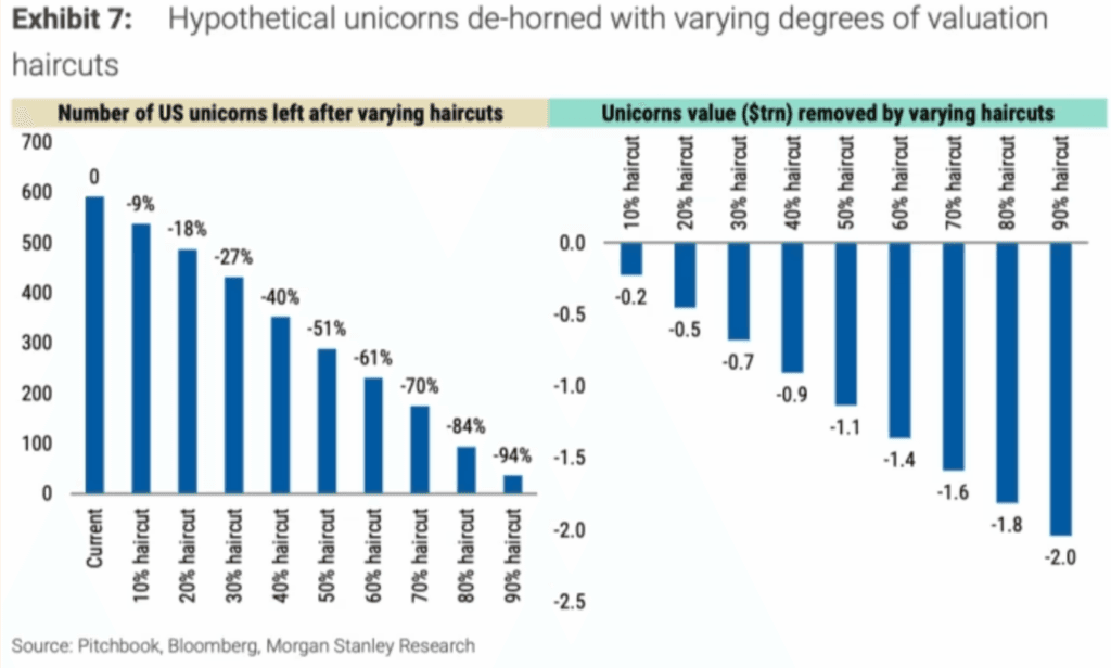 In the coming years, Cowboy predicts a marked reduction in the number of unicorns. By their estimate, the herd will dwindle to around 350: about two-thirds of its current size. Morgan Stanley's research forecasts a more drastic decrease based on secondary transaction prices, which suggest that startup valuations will fall by half. This would reduce the unicorn population by 51%, erasing around $1.1T in value.