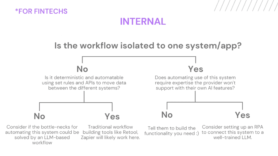 Trey suggests that founders approach analyzing internal workflows with the following thought process: First, consider if the process resides within one software system, like Salesforce or Concur. If so, can the provider build the desired AI functionality natively with their own developer tools and resources? In this “yes, no” scenario - the most common scenario Trey experiences with tech companies - you likely want to reach out and request the feature rather than build it from scratch: