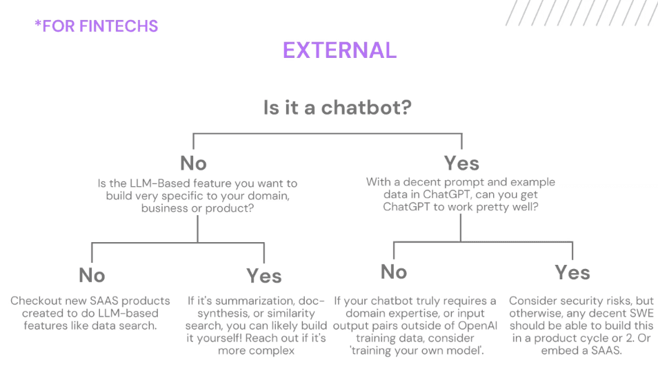 Trey points out that a very common path through the “external” framework decision tree is “no, no” and these ideas often take the form of some type of data-searching assistant (i.e. defog.ai). If founders find themselves answering “no, no” (i.e. not a chatbot, and not domain specific), then their first step should be to hunt for an existing solution. There are likely a number of new SaaS products filling this need, and founders should lean on these products instead of rolling their own solution.
