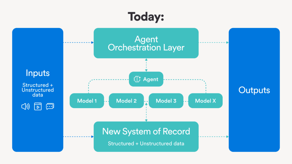 One transformative power of a System of Agents lies in its placement: right at the source of data creation. For builders, the key is finding roles and functions inside a company that touch the company’s most powerful data and sit in front of the System of Record. Using a System of Agents to synthesize that data—whether unstructured or structured—means you own the right to initiate actions with other roles and systems. When an agent owns the interface where data is born, your system then has the right to orchestrate every downstream action.
