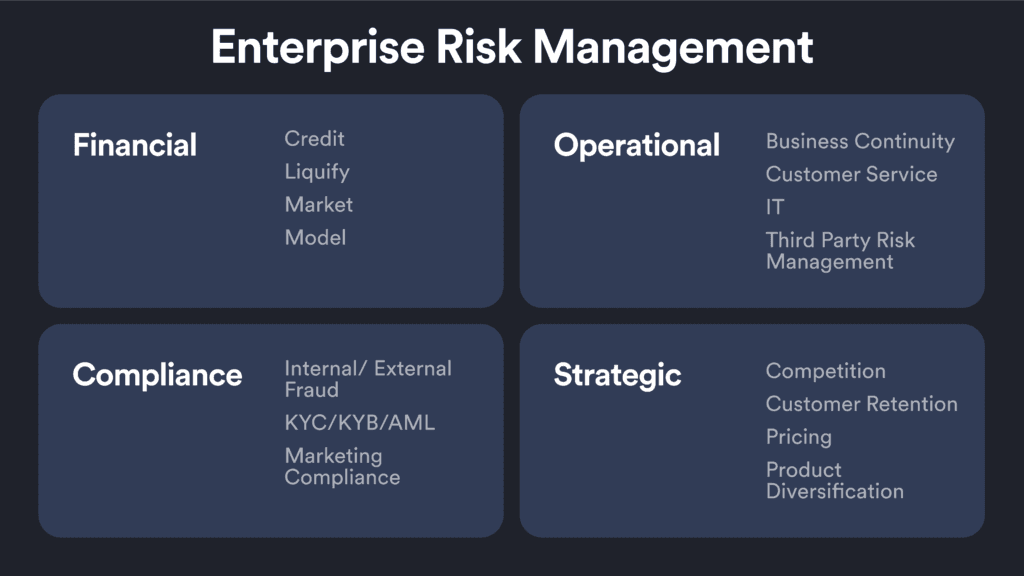 ERM is all about taking a broad look at risks across the whole organization and managing them effectively. Typically, ERM covers four big categories, which come from the Committee of Sponsoring Organizations of the Treadway Commission (COSO) framework: Financial, Operational, Strategic, and Compliance risks.
