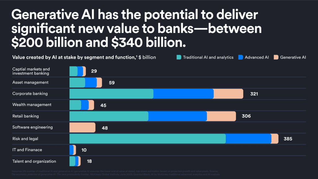 It’s no shock that generative AI has huge potential for banks, whether it's about boosting efficiency or driving revenue. In fact, McKinsey put out a report in December 2023 called "Capturing the Full Value of Generative AI in Banking," estimating that AI’s potential value could hit around $340 billion (about $1,000 per person in the US).