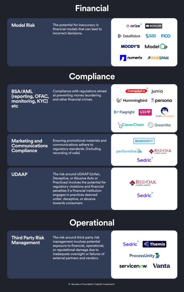 Through our interviews and research, we also identified several startups and established players that are focusing on Financial, Compliance, and Operational risks with AI solutions. (Note: this is not a comprehensive list, but the names of the organizations that came up during conversations, with a focus on newer companies rather than incumbents).