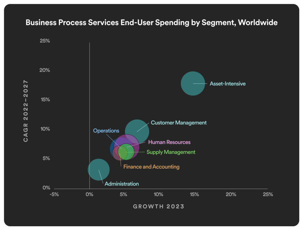 In enterprise companies, services get chopped up into IT services and business process services. (The history of these markets are fascinating globalization tales. American companies learned long ago that they gained significant cost savings by outsourcing IT services teams in India, and India currently exports some $240 billion each year in IT services.) Gartner estimates current worldwide spending on IT services at $1.5 trillion in 2024, which will reach $2.3 trillion by 2028. They estimate the size of the business process services market will reach $303 billion by 2027.