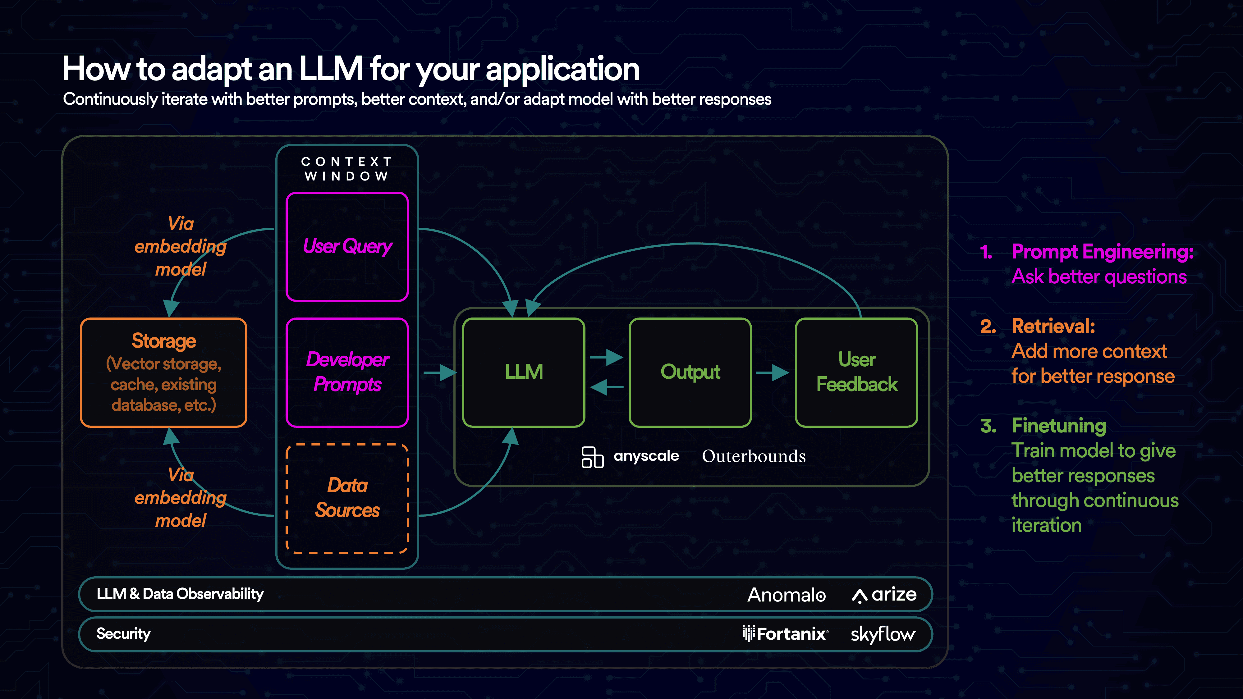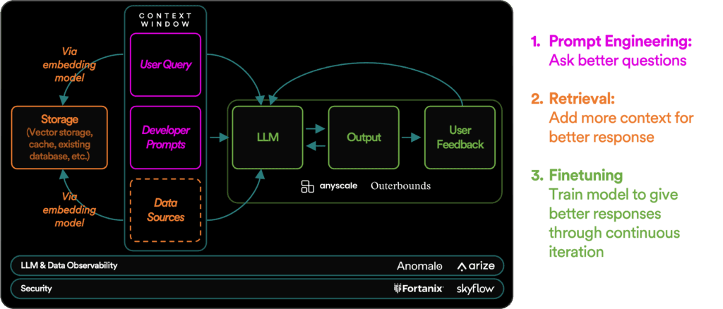 Fine-tuning refers to the process of taking a pre-trained model and tailoring it to a specific use case by training it further on a smaller, task-specific dataset. It’s the most resource-heavy adaptation method and involves altering the LLM’s underlying parameters. But unlike training an LLM from scratch, which demands multiple terabytes of data, fine-tuning can be successfully performed with several hundred or thousand examples. Companies like Anyscale and Outerbounds offer end-to-end solutions to support enterprises in creating production-grade, fine-tuned LLMs.
