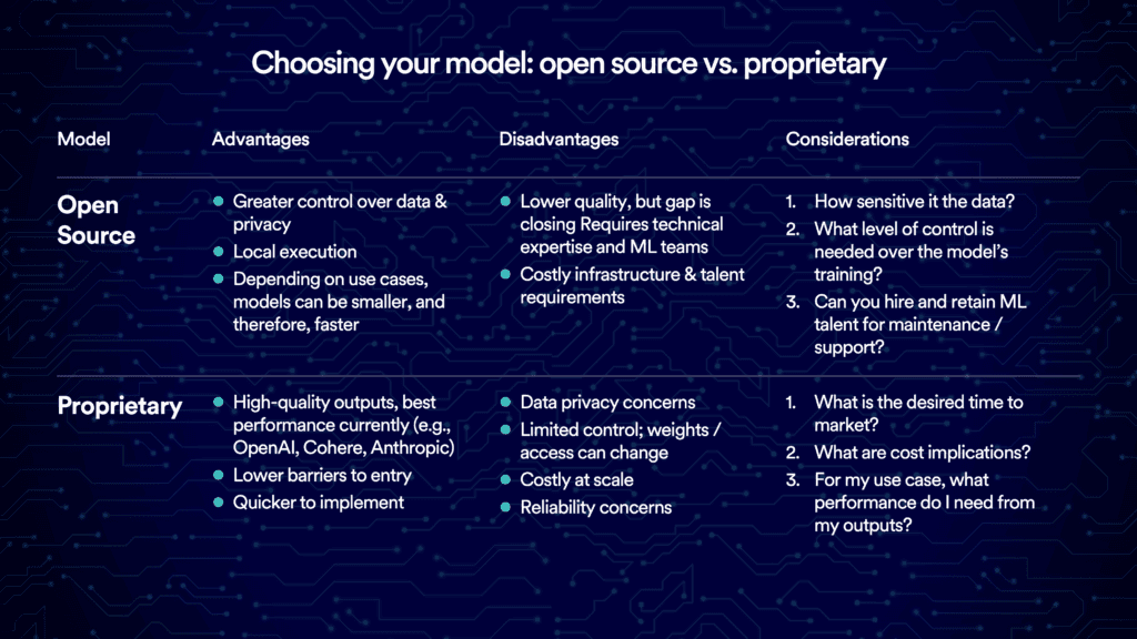 Once your use case is clear, the next step is to decide the best way to deploy generative AI to achieve it. Let’s break down your options and review the key considerations that should guide your choice.