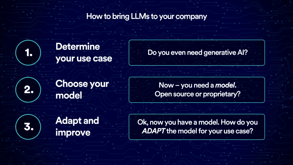 When it comes to generative AI, the only thing that’s constant is the speed at which this technology is changing. Over the past few months, we’ve spoken in-depth with a diverse range of builders and technologists who are exploring generative AI. From engineers at large-scale enterprises who are integrating this technology into their processes and products, to early-stage founders creating net-new experiences, we’ve gathered a wealth of insights that can be learned only by doing. Focusing on the unique needs of enterprises, we’ve transformed these learnings into a clear, step-by-step framework for leaders who are aiming to introduce LLMs into their organizations. In this post, we’ll walk through each step in detail. Let’s get started!