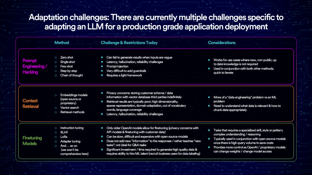 This chart below summarizes the challenges and considerations that enterprises should weigh when deciding which of these three adaptation methods to pursue.