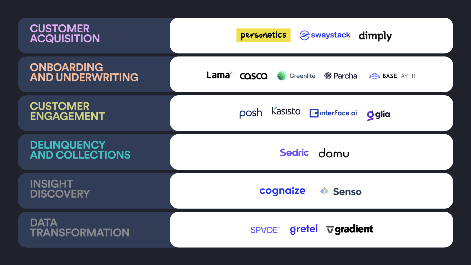 Underpinning these applications is a crucial layer of data infrastructure. In the insight discovery category, Cognaize and Senso are helping banks make sense of their vast stores of unstructured data—addressing the 80% of banking data that traditionally has been difficult to analyze and act on.