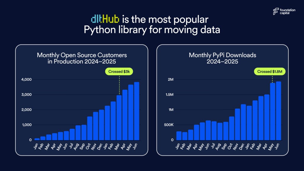 As a lead investor in dltHub's seed round, I've watched dlt scale dramatically: from 87 companies in production in December 2023 to over 4,000 today, spanning startup unicorns and Fortune 500 firms. Just last month, dlt was downloaded more than 2 million times on PyPI, making it the most popular Python library for moving data and one of the fastest-growing data tooling projects I've ever seen.