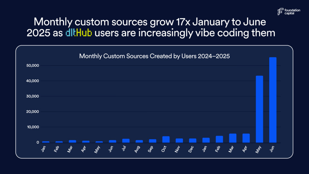Even more compelling is the momentum from LLMs and the rise of "vibe coding": a new way of programming in natural language (concurrent with software 3.0) that's allowing the long tail of niche data sources to become a shared catalog of pipelines. This June alone, more than 40,000 dlt sources were created by users, demonstrating the power of AI-assisted development at scale.