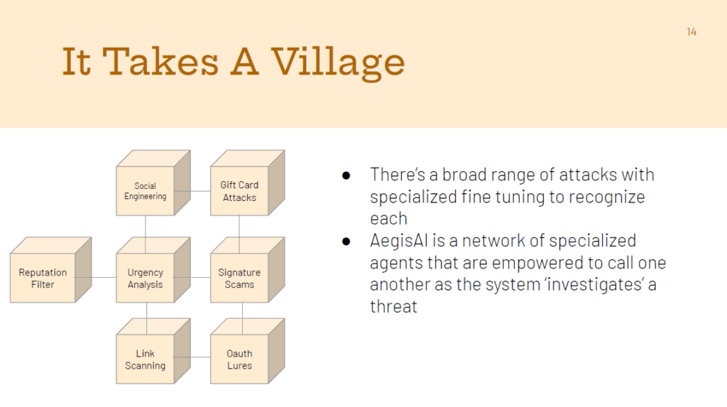 AegisAI replaces rules with AI agents that detect and classify threats just like expert security analysts. The platform includes a network of specialized agents individually focused on areas like urgency analysis, signature scams, gift card attacks, OAuth lures, link scanning, etc. These agents are empowered to call one another as the system investigates threats, creating a collaborative investigation process that adapts to new attack patterns in real-time.