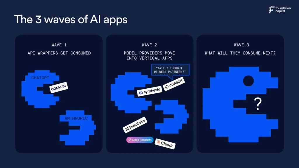 Wave 2 (2023-2024): The AI-native era. The second wave of AI startups tried to be more truly “AI-native.” These teams started from first principles: they designed products around the unique abilities of LLMs, built custom data pipelines to augment model outputs, and tightly embedded AI into user workflows. But as model providers moved up the stack – launching their own apps, changing API terms, building competing products – these startups found themselves in a precarious position. Many got squeezed by the platforms they depended on.