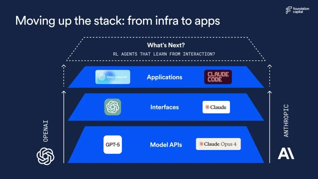 Wave 3 (2025): The agentic era. In the current wave of agentic AI, a new generation of reasoning models and post-training techniques is further blurring the line between AI infrastructure and end-user applications. Model providers are shipping agentic products (like OpenAI’s Agent Mode and Anthropic’s Claude Code) directly to users. For startups, this means the bar for “AI-native” has risen even higher: it’s not enough to leverage a powerful model, you have to be building a learning system that can adapt and improve over time.