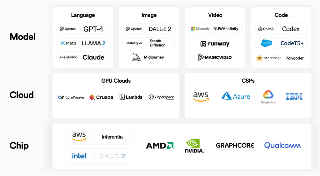 We’re also seeing the rise of new cloud providers specifically focused on GPUs and LLMs. The large cloud service providers have been unable to keep up with demand for GPUs and we have seen an unbundling of sorts in the industry. Companies like Lambda Labs and Coreweave have emerged as viable alternatives to the big cloud providers with more GPU access and generative AI-specific support.